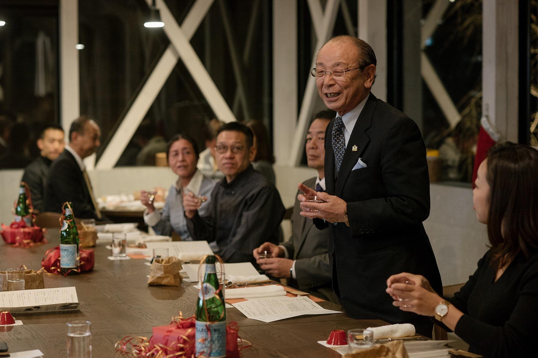 朝倉氏遺跡保存協会・岸田清会長の音頭で、振る舞い酒のdancyu webオリジナル清酒「d酒」で乾杯!