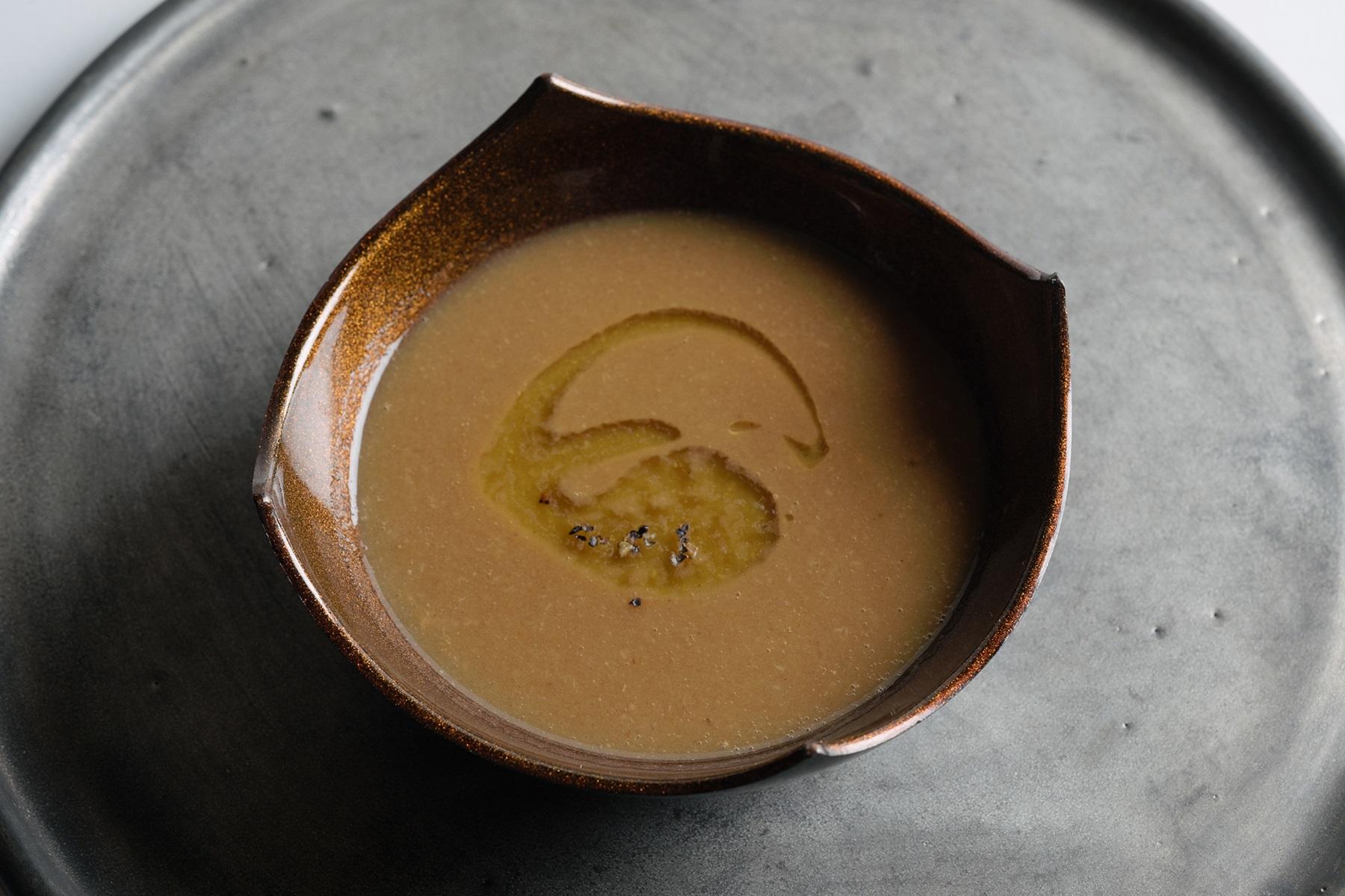 「そんな幻の魚、アラレガコを丸ごと里芋と一緒に炊き込んで余すところなくすりつぶしたスープです。イタリア料理のパッサートという調理法で、いわゆるすり流しですね。形はわからなくなりますが、身も骨もエキスもぜーんぶこのスープの中に入っています」
