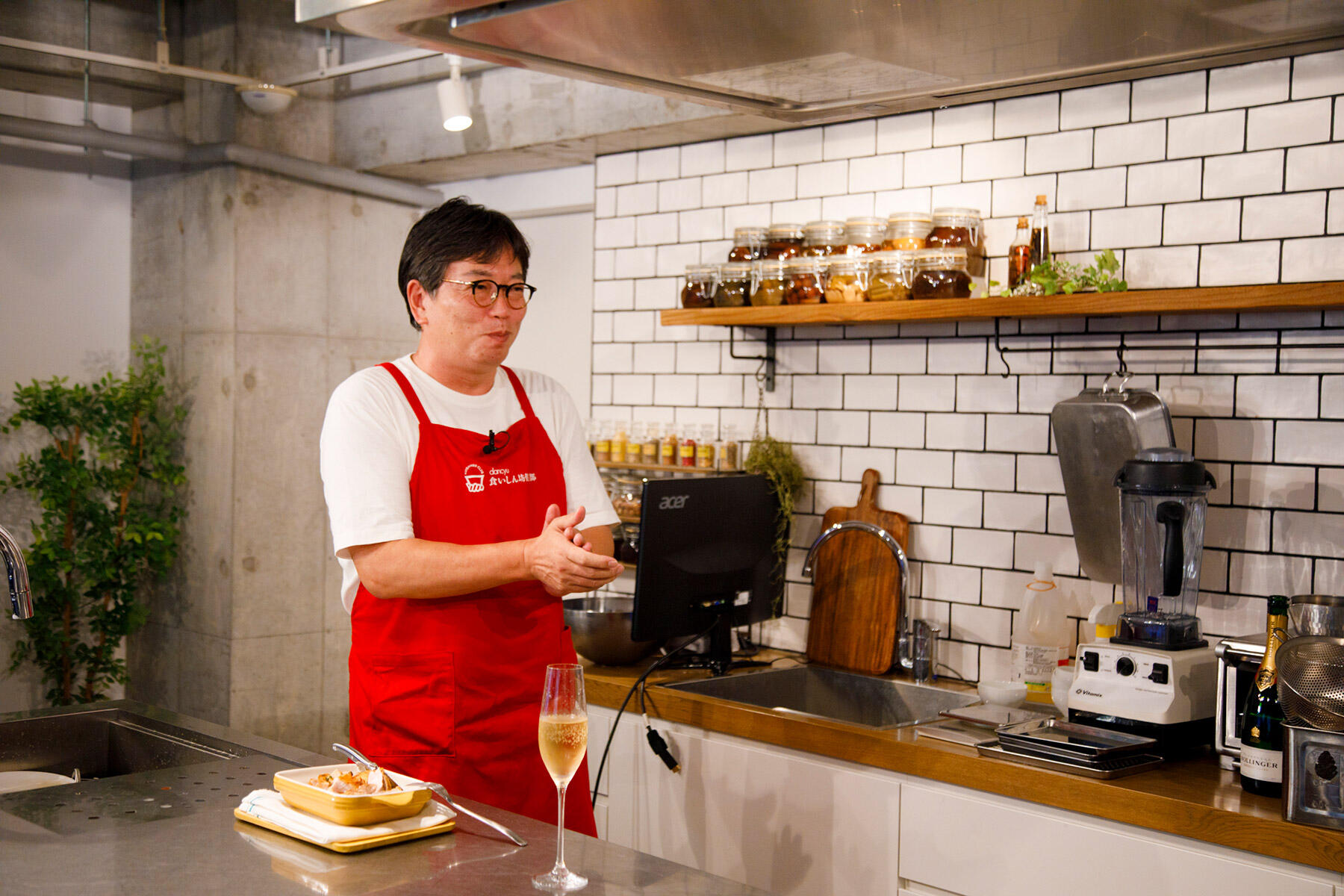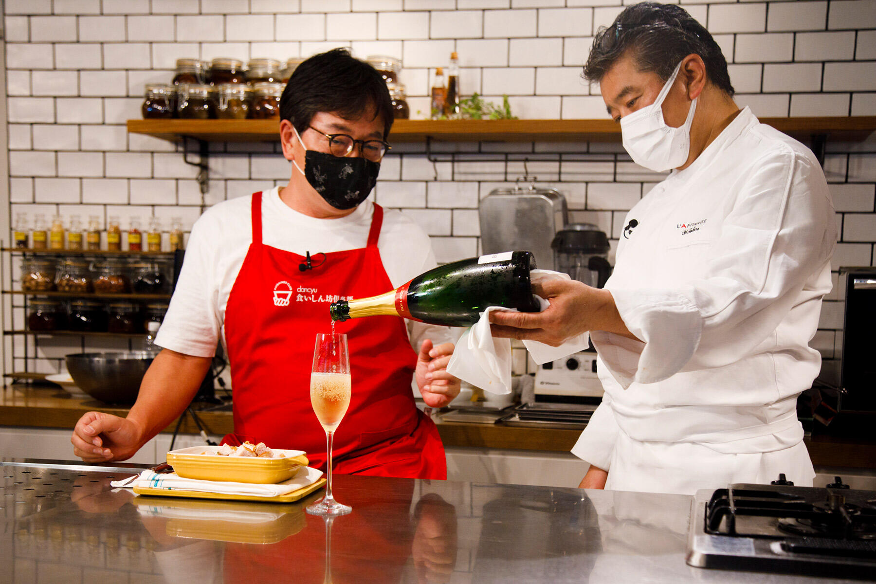 高良シェフ、植野編集長、そしてアシスタントの編集部員神鳥の3人で、シャンパーニュ片手に乾杯からスタート。いつもより豪華な演出に、植野編集長のダジャレも滑らか。それにつられて高良シェフはペースを乱される?