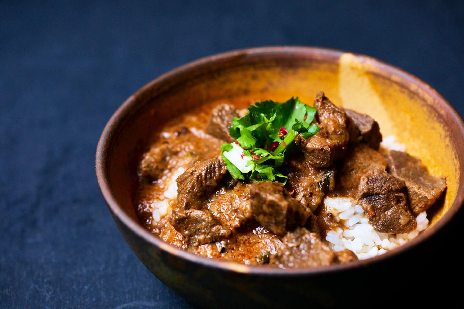 「dancyu祭」ではそんなジビエカレーから、エゾ鹿と猪のビンダルーが繰り出される。ビンダルーは西インド・ゴア地方に伝わる酸味を効かせたカレーだ。通常は豚肉でつくるが、代わりに山中を駆け回っていた脂たっぷりの猪肉を使用。北海道のエゾ鹿を組み合わせて独特のコクを出している。猪肉は弾力があり、脂身のシャクシャクした歯触りが小気味いい。エゾ鹿は柔らかくクセは皆無。赤身肉の旨味が味わえる。加えて、印象的なのは香りの華やかさだ。乾燥ではなくフレッシュのミントをふんだんに使っているという。さらに、酸味の元となるワインビネガーに替えて、京都・丹後で無農薬の自家栽培米から醸す「富士酢」を投入。純米酢特有の発酵の風味が味に奥行きを生み出している。