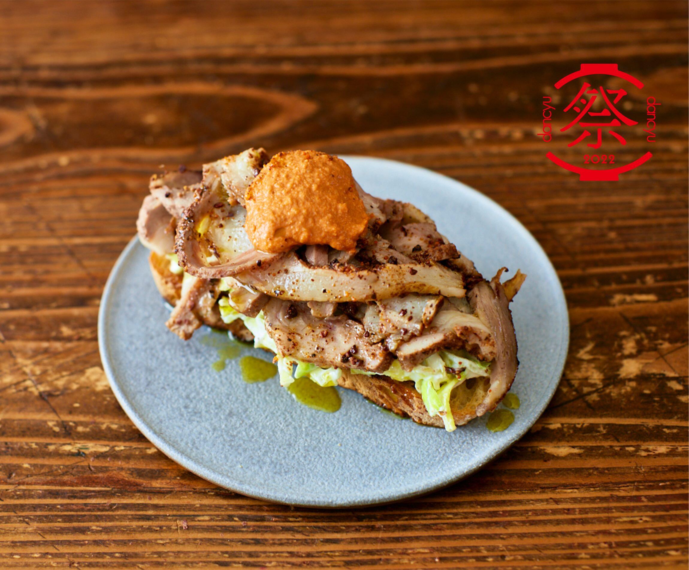 まずは、“豚バラローストのブルスケッタ with SOMEWHERE BAKERY”。信州豚のバラ塊肉を藁で巻いて鍋に詰め、オーブンでじっくり蒸し焼きにしたローストポークを、SNSでも話題のSOMEWHERE BAKERYの天然酵母パンにたっぷりON。塩のみのシンプルな味付けと思わせて、実は下味のスパイスに秘策あり。自社輸入のカカオ豆から加工したカカオマス、カカオニブ入りのスパイスミックス“アマゾンカカオデュカ”を肉にまぶしているのだ。調合は、スパイスの魔術師、シャンカール・ノグチさん。