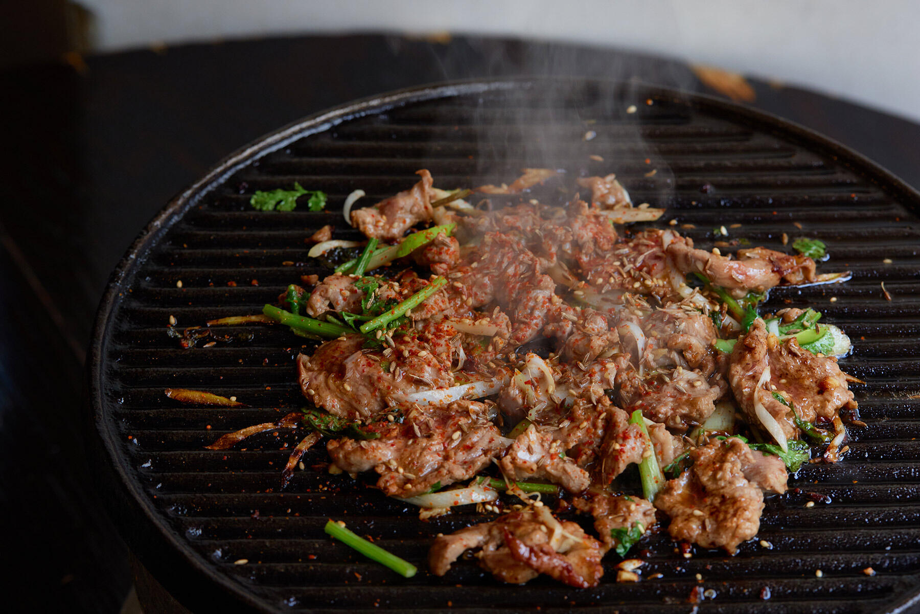炙子烤肉とは北京式の焼肉のことで、醬油ベースの下味がついた羊肉を刻んだネギや香菜と和えて豪快に焼き上げたもの。噛みしめるごとに旨味が口いっぱいに広がります!