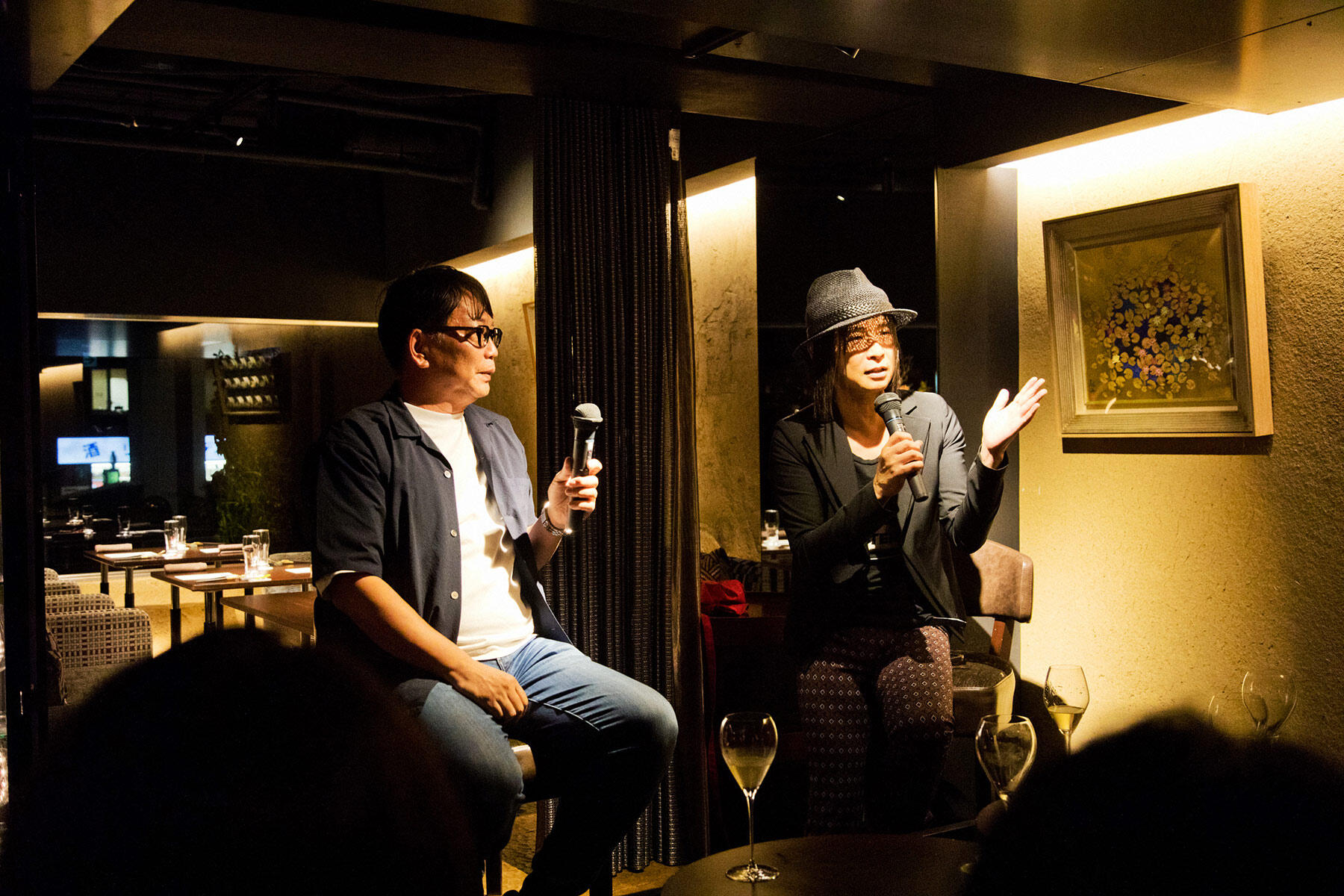 会場は港区のレストラン「Bar & Restaurant COCONOMA」。愛知、東京、京都で開催された日本凱旋ツアー『辻仁成 アコースティック セレナーデ フロム パリ 2023』を終えたばかりの辻さんに会える一夜限りのトークショーであり、かつ、辻さんと植野によるお笑い料理ユニット「だんちゅうでござる」の久々のイベントということもあって、今回はたくさんの方にご応募いただきました。“スペイン・バル飯ナイト”というタイトルの通り、18:30に受付が開始すると、店内のバーカウンターにはタパスとピンチョスがズラリ。もちろんウエルカムドリンクは、スペインのスパークリングワイン、カヴァ。奥の特設スペースでは、植野が原木のハモンセラーノを切り分けました。