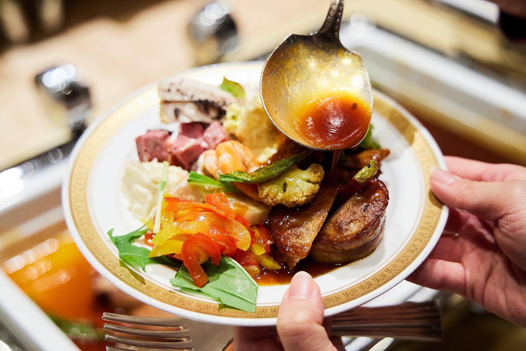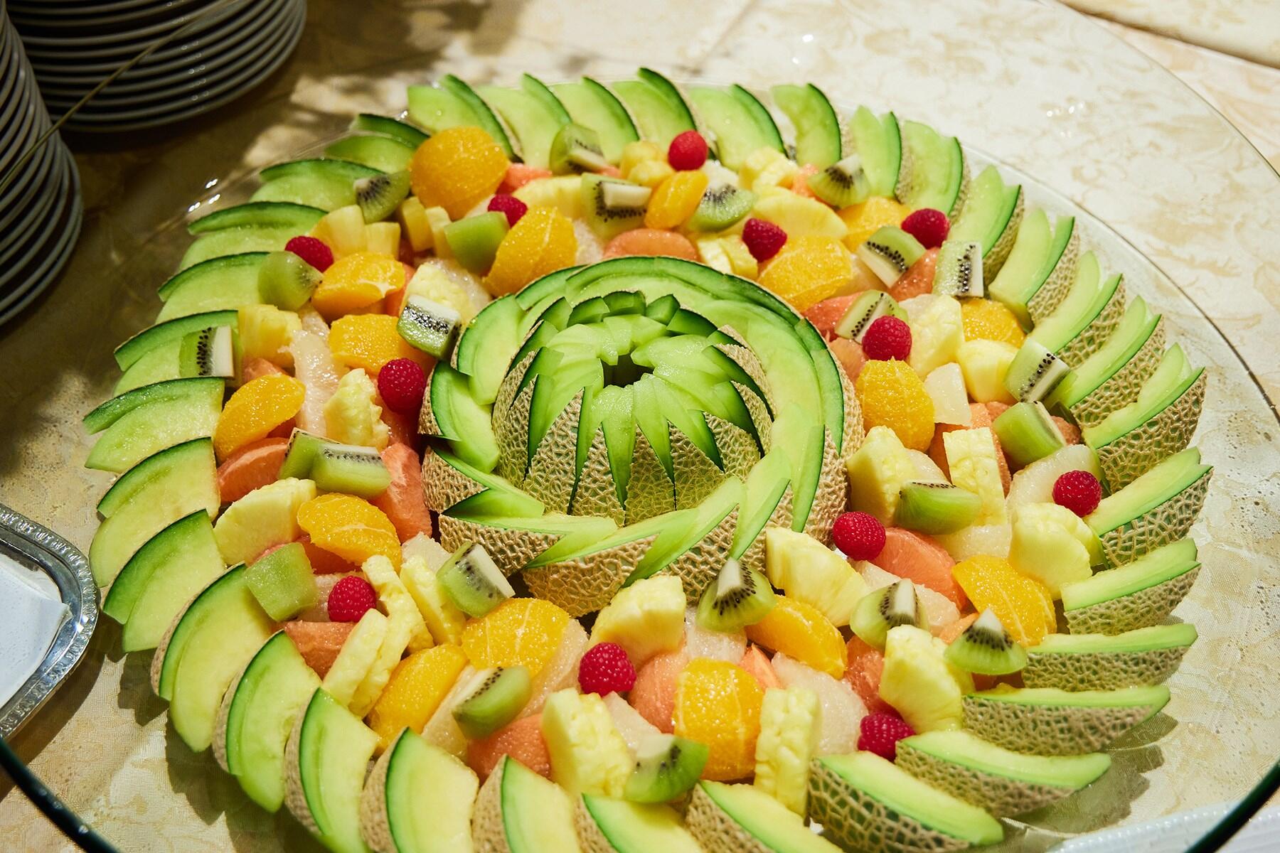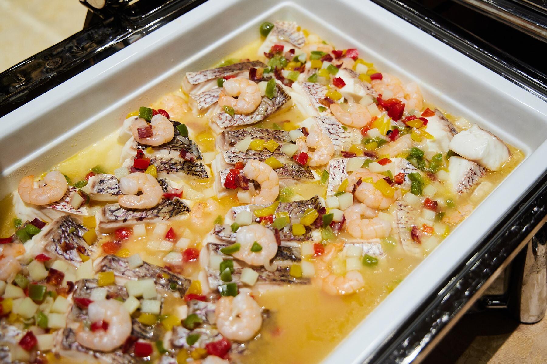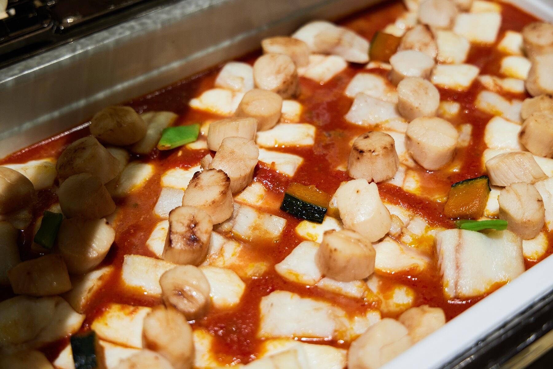 ホテルのパーティメニューの一部をご紹介!真鯛と小海老のベーク ムール貝のジュースとプティレギューム、和梨とハモンセラーノ、ルッコラのサラダ 山葵クリーミードレッシング、小エビの冷製アヒージョと白身魚のムースロール、季節のカットフルーツ、平目とホタテ貝のロースト ケッパーとトマト、アンチョビのソース。