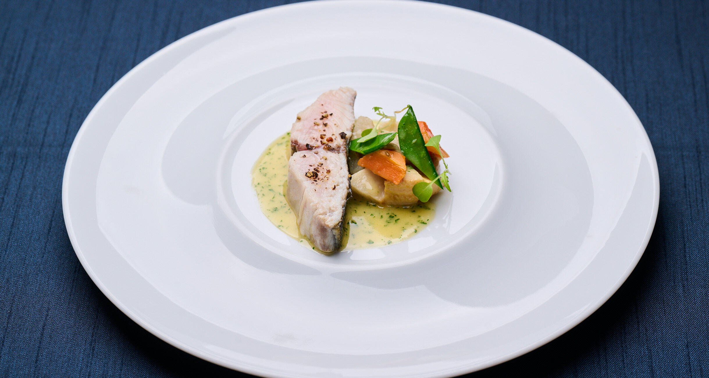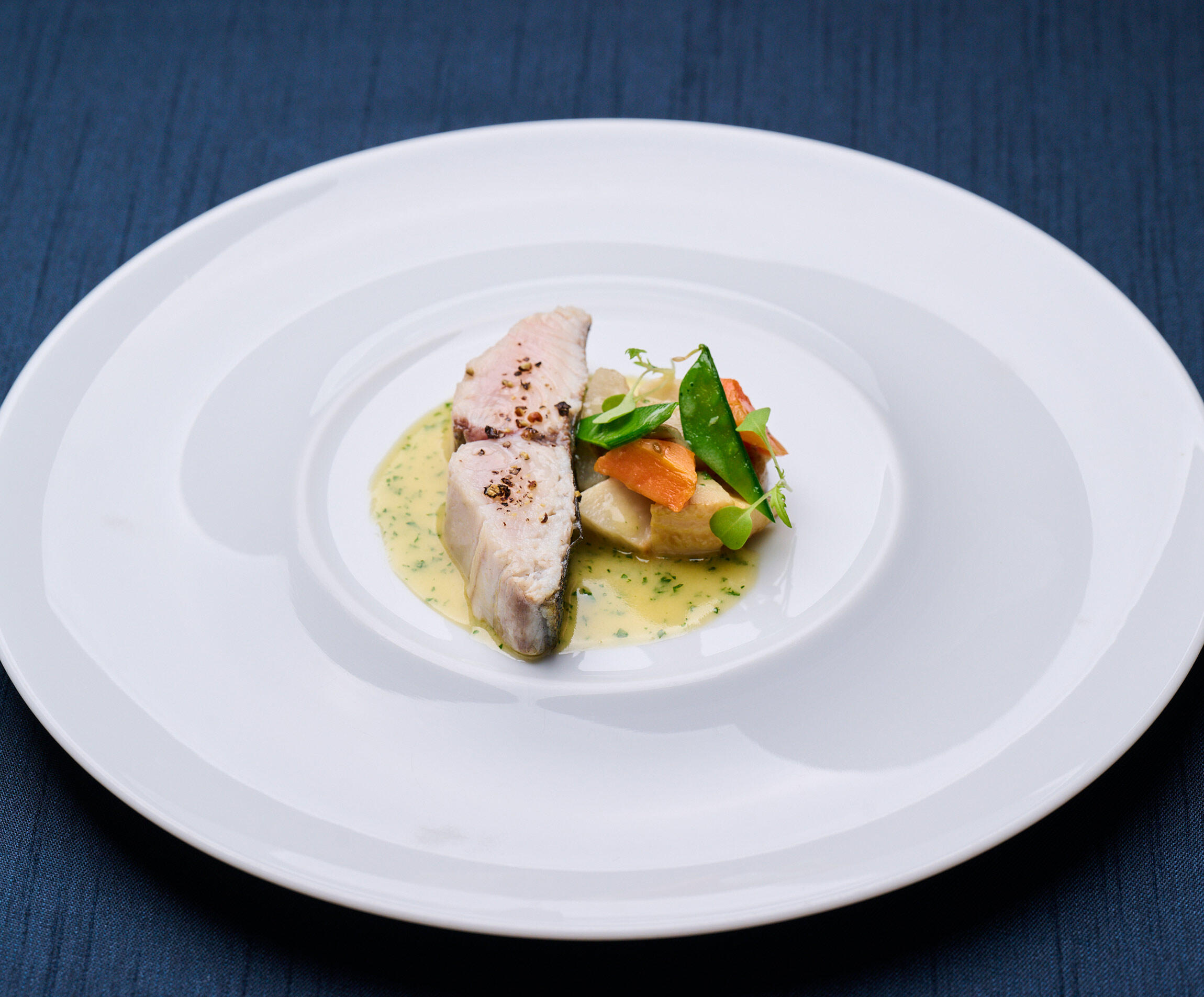 繊細な口どけに寄り添うのは、エシャロット、白ワイン、バターがベースの、これも伝統的なブールブランに、吟醸白みそを隠し味に足した独創的なソース。発酵由来のコクと穏やかな酸味が、サワラの淡白な味わいに輪郭を与え、一段上の高みに引き上げる。