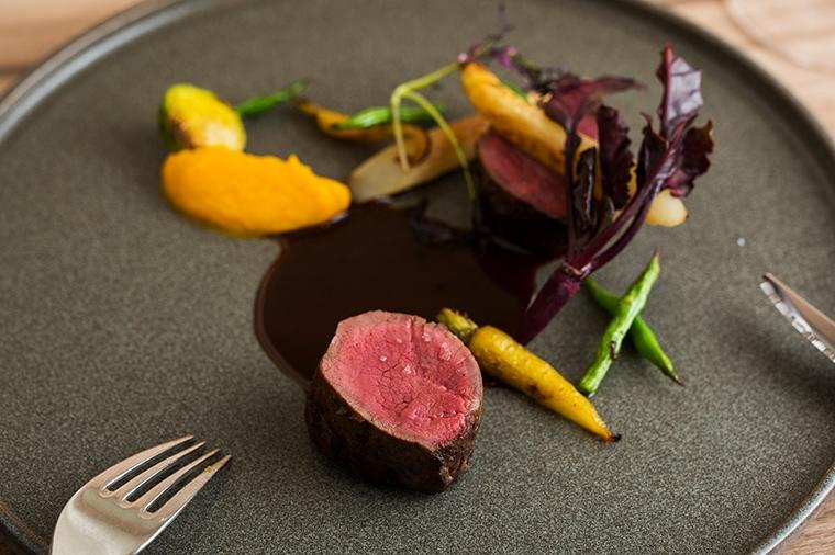 美しいエゾ鹿のローストに、鹿のだしと赤ワインのソース。グラスワインのシラーだって進んじゃうもんね。ち...