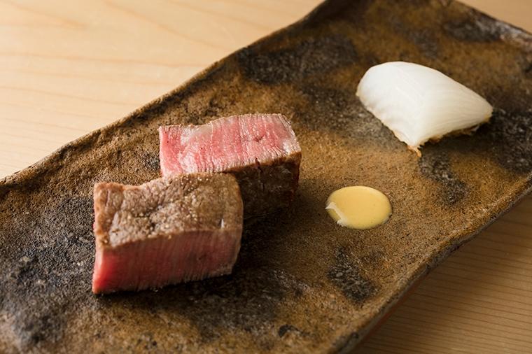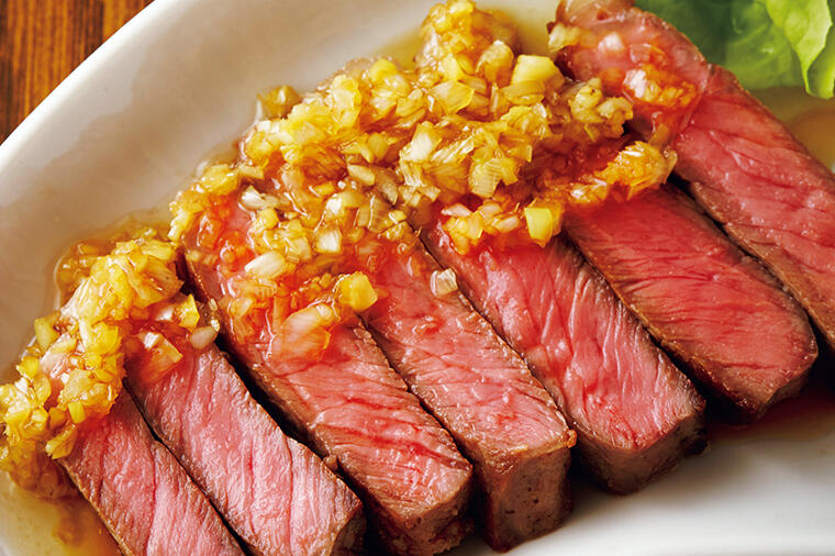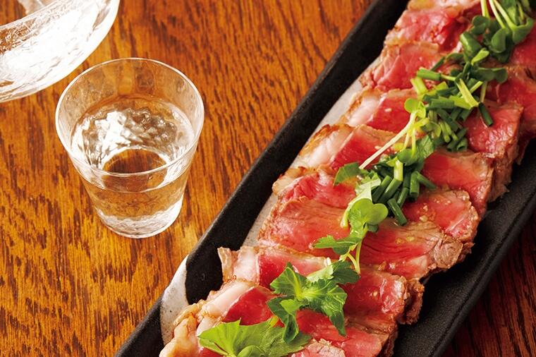 ジューシーな肉、薬味、そこへ日本酒を合わせて極上の旨味を堪能するひと皿。美しい肉の断面を見せるように...
