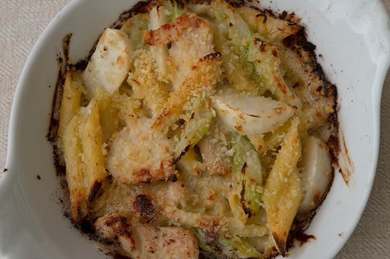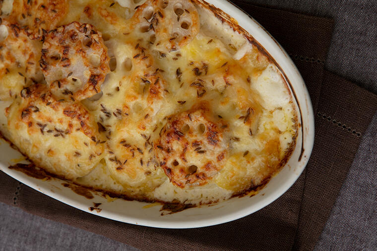 歯ごたえのいいれんこんと甘いじゃがいもが好相性な一品です。ベシャメルソースを使わない、チーズの旨味を...