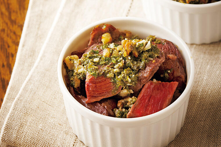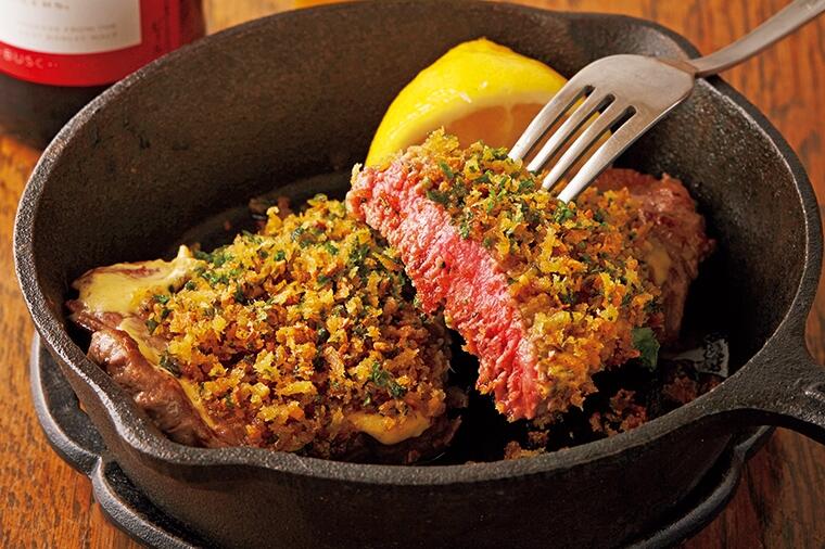 角切りステーキに、にんにくが主体の香り豊かなエスカルゴバターをのせて焼いた一品。カリッとしたくるみの...