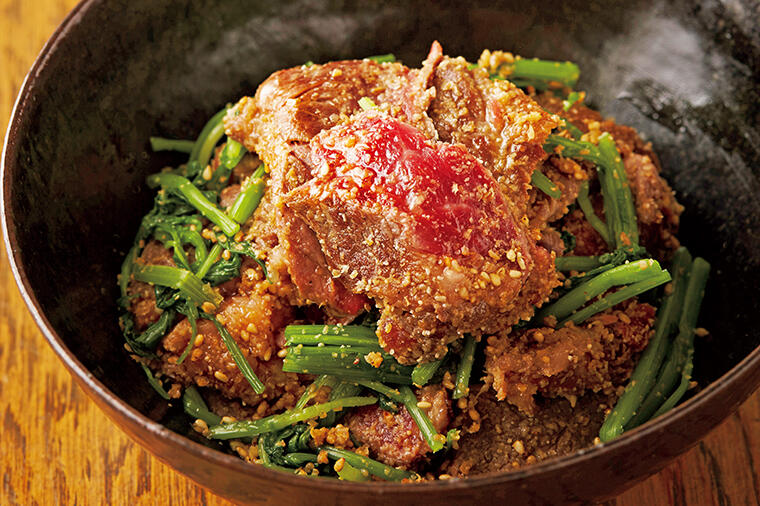 甜麺醤で甘く調味した挽き肉と、豆板醤の辛味と香りをまとわせたごはんが、絶妙のコントラストを生む。魂を...