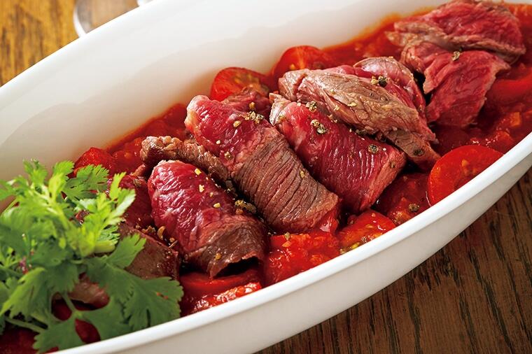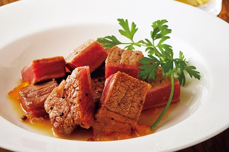 赤身肉の美味しさを引き立てるオレンジ・マーマレードベースのソースが美味。甘味を和らげる隠し味に、芳醇...