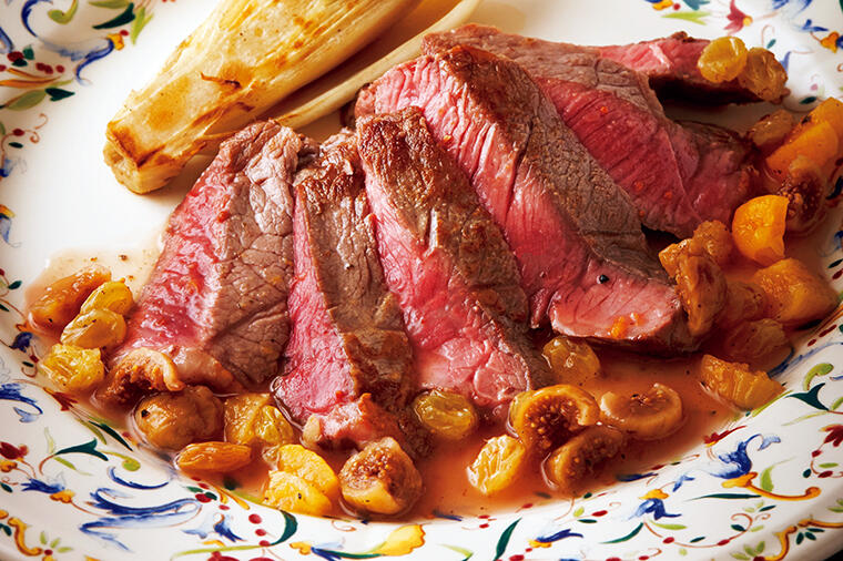 しっとり柔らかなサーロインステーキに、ドライフルーツにワインを加えた甘酸っぱいソースがよく合い、さっ...