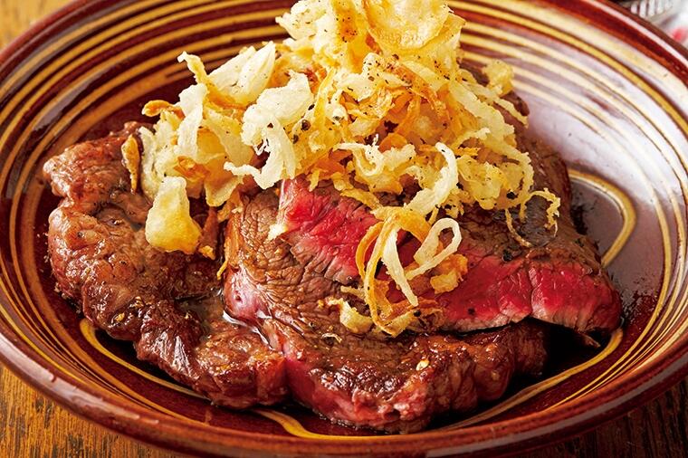 ステーキつまみの付け合わせには、オニオンフライがお薦めです。肉、フライ、そしてワインを口に含む瞬間が...