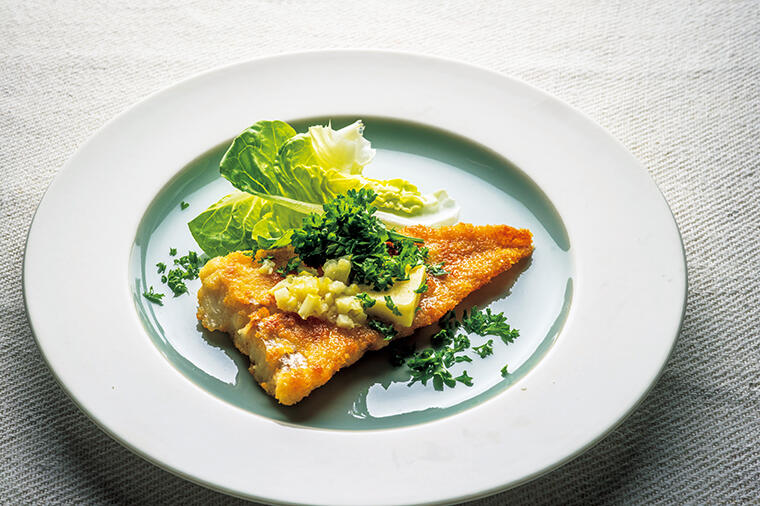 バターの香りをまとい、こんがりカリッと焼き上げた白身魚に、塩レモンと刻みパセリ、バターを添えます。”...