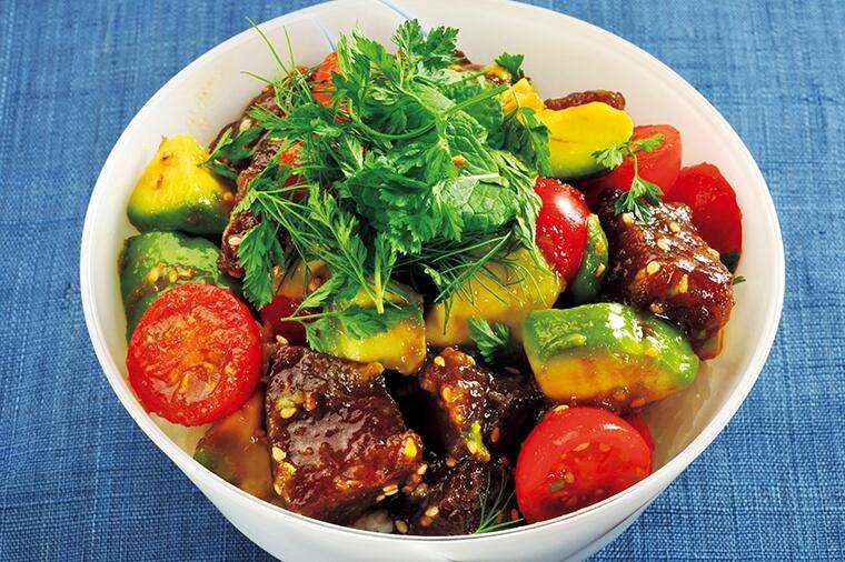 「まるしげ」の人気メニュー、くじらの刺身用の赤身肉を使ったポキ丼です。旨味の濃いくじら肉と、アボカド...