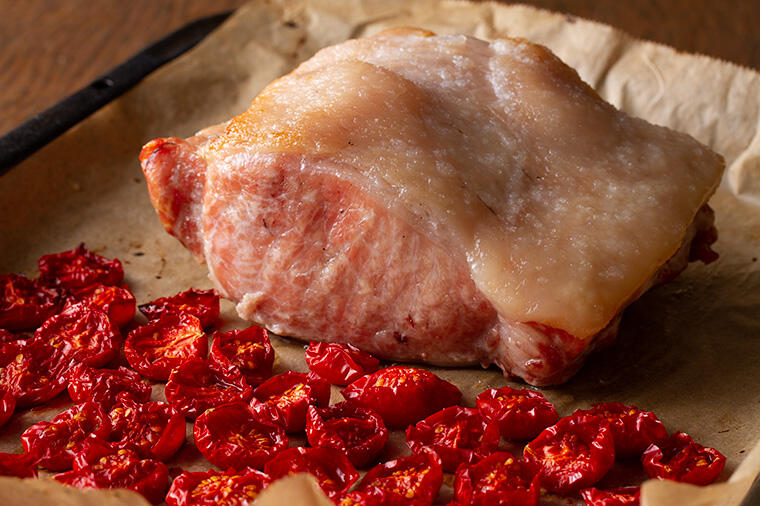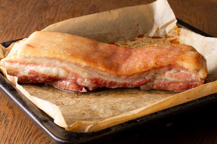 塩豚にして低温でじっくり焼いたバラ肉は、脂を内包して旨味たっぷり!オーブンから出した後にフライパンで...