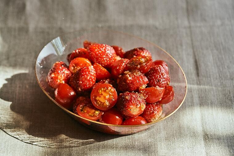 トマトといちごという意外な組み合わせですが、醤油風味のドレッシングでマリネしすることで一つにまとまり...
