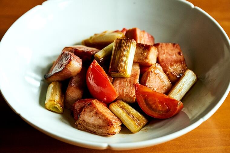 ハムの旨味とねぎの歯ごたえ、トマトのジューシーさの三重奏がたまらない一皿です。中華や洋風、またはエス...