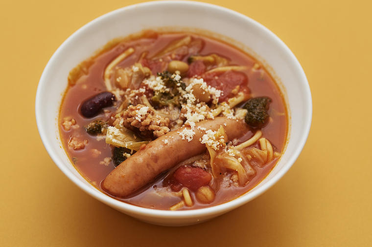 有賀薫さんが披露するミネストローネは包丁を使わない手軽なつくり方で、本格的なレシピに引けを取らない味...