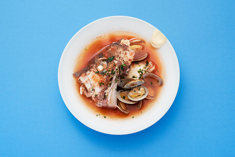 簡単ブイヤベースに使う具材は、鯛のアラとあさりのみ。トマトジュースと水で煮出せば、立派な魚介スープの...