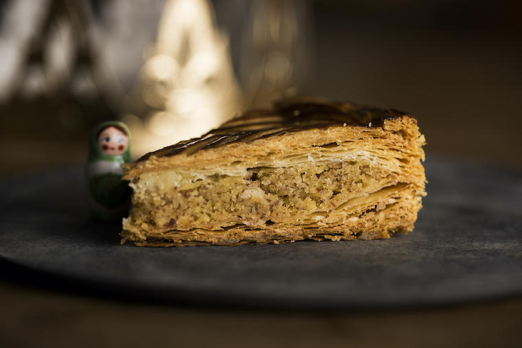 フランスの伝統的な焼き菓子のガレット・デ・ロワは新年を祝う菓子。なかに埋め込まれたフェーブが入ったピ...