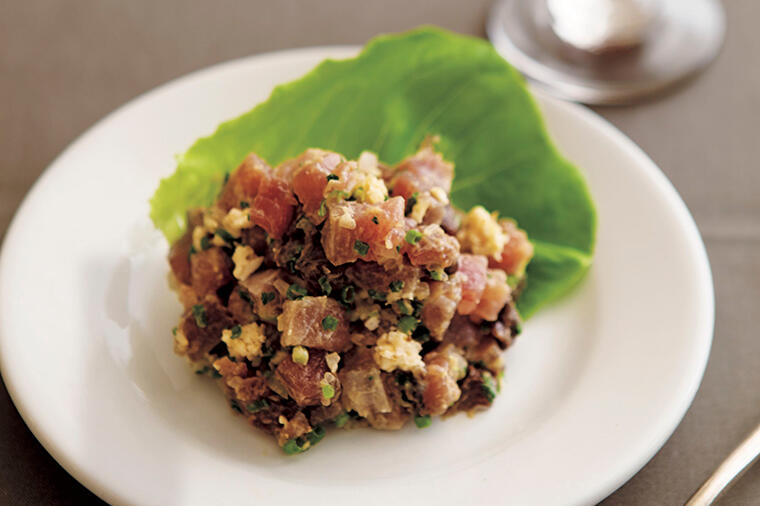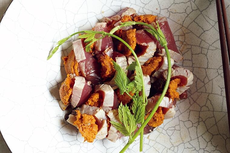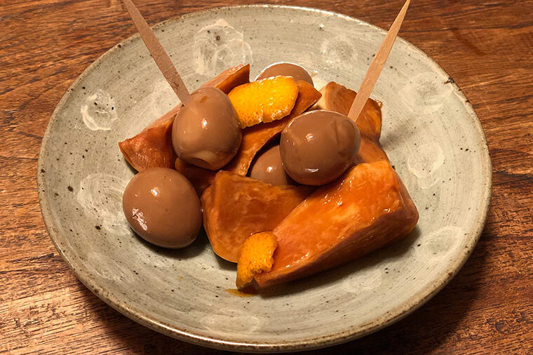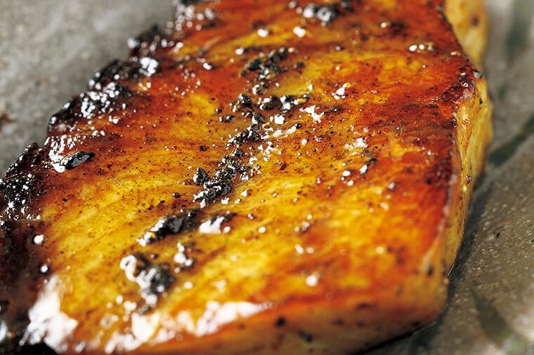 たれに山椒を漬け込んで、香り豊かな一品に仕上げます。今回の魚は金目鯛。脂ののった金目鯛を漬け込むと、...