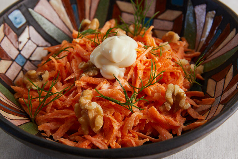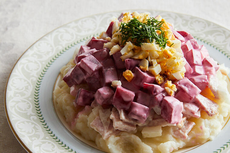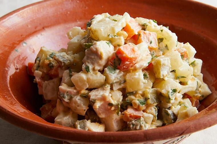 ロシアの代表的な料理の一つであるポテトサラダ。さまざまな種類の食材を使い、味も食感も多様で楽しい一皿...