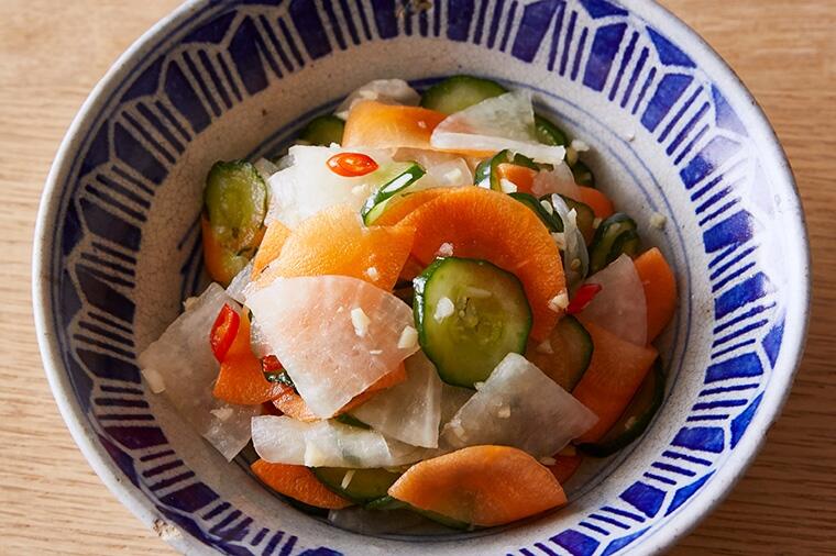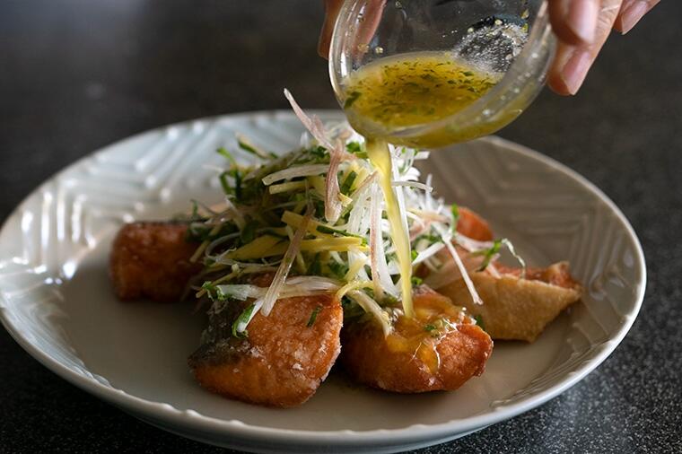 野菜と一緒に漬け込まず、揚げ焼きにした鮭に香味野菜をたっぷりと添えて、甘酢ソースを回しかけた彩り鮮や...