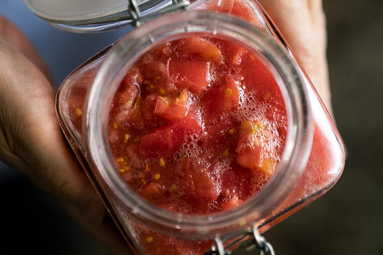クリュはフランス語で“生”という意味。完熟のトマトを、皮も種もそのまま刻み、塩とほんの少しの砂糖を混...