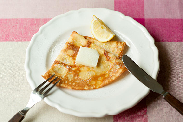 ちりめん模様に焼き上げた熱々のクレープにバターをのせ、砂糖をふりかけ、レモンをキュッと搾って。生地の...
