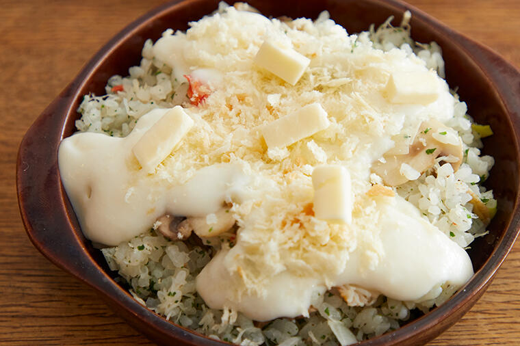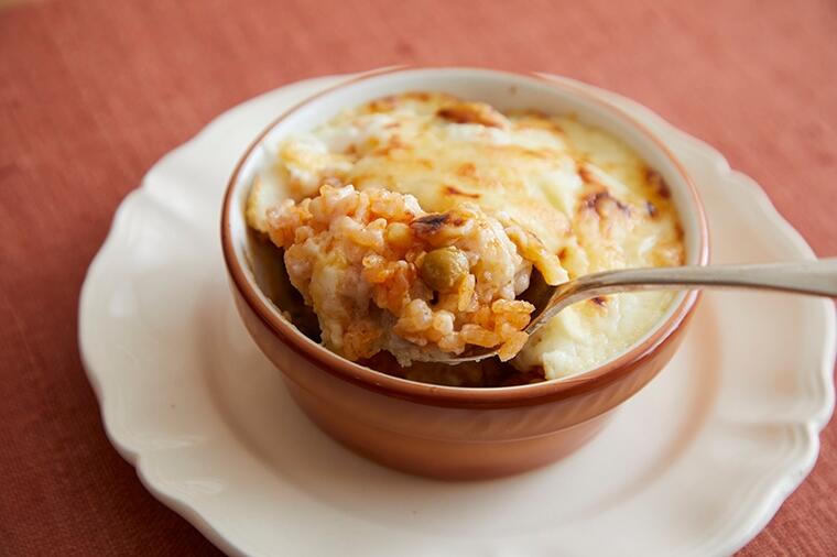 ケチャップでご飯と具材を炒め、つくっておいたベシャメルソースをかけてオーブンに入れればあっという間に...