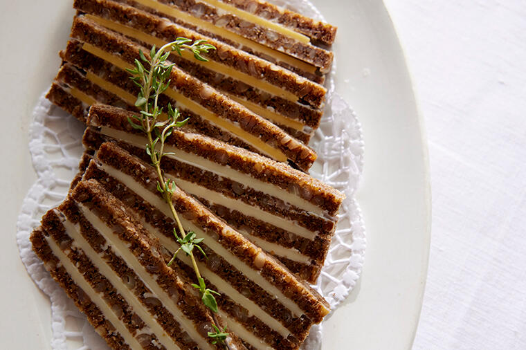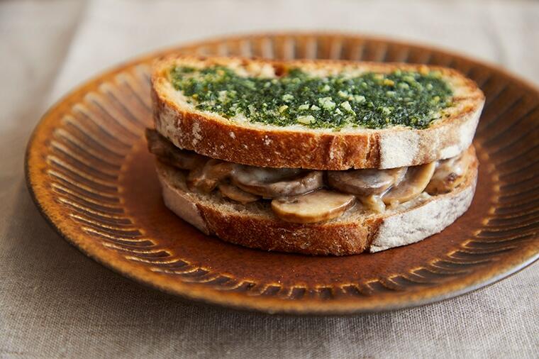 ライ麦パンなどハード系のパンにベシャメルソースで和えたきのこをサンド。上にはパセリバターを塗って香ば...