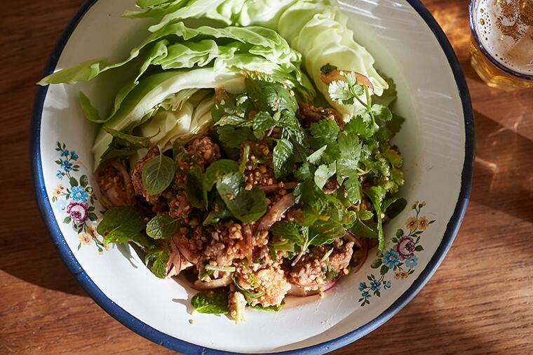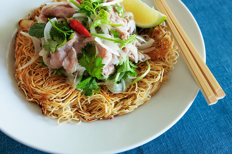 ミントと香菜をたっぷり、ライムをキュッと搾って爽やかに仕上げます。ここでは中華生麺を使いましたが、中...