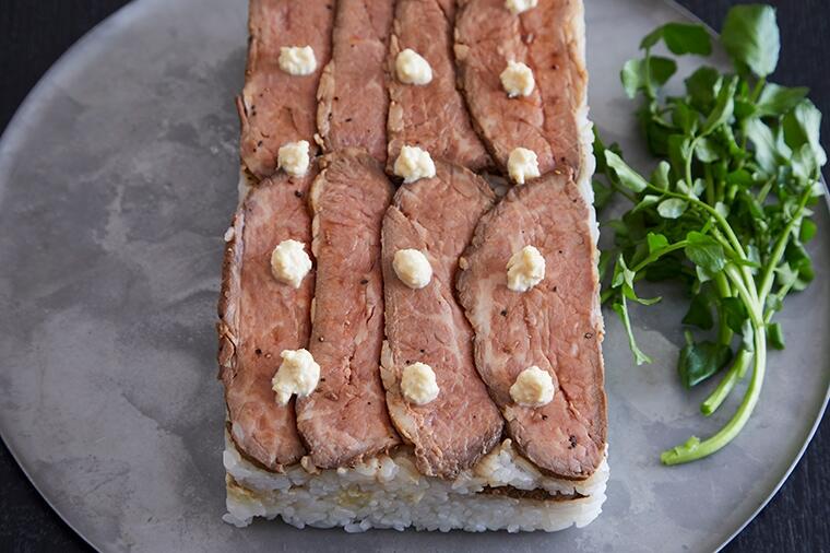 市販のローストビーフを贅沢に使った、冷酒にもワインにも合う押し寿司のレシピです。夏の暑い日でもつい箸...