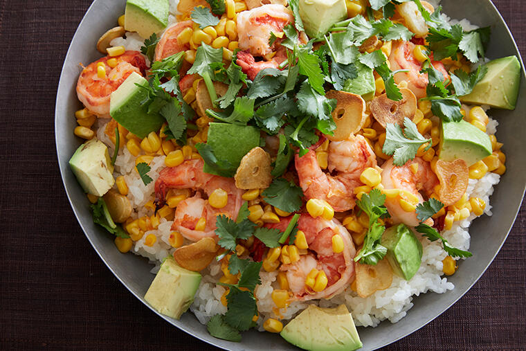 レモンとナムプラーで味つけした酢飯をベースに、にんにくオイルで炒めた海老やとうもろこしに、香菜、アボ...