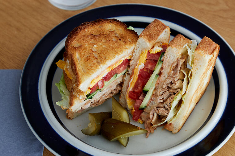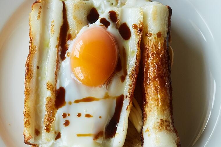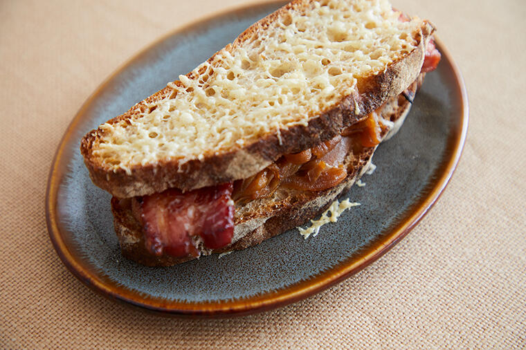 クロックはフランス式ホットサンド。ここでは、カリッと焼いたベーコン、じっくりと炒めた飴色玉ねぎで、ボ...