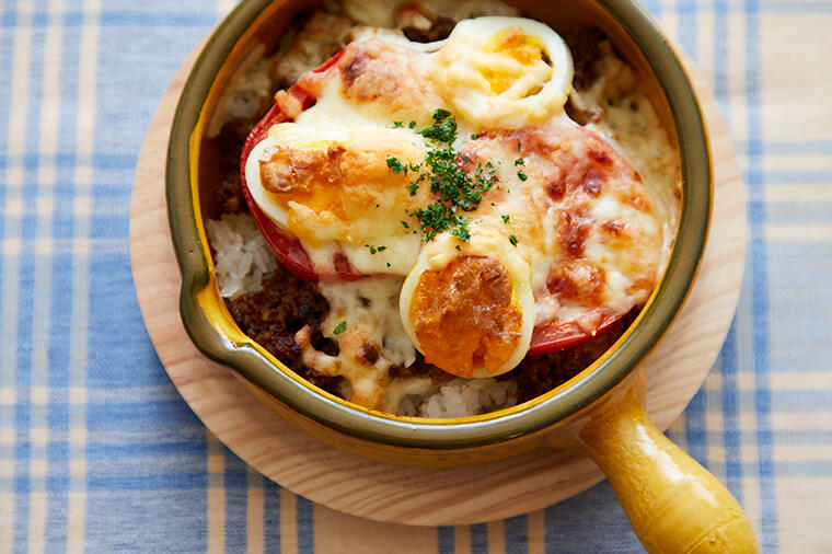 カレー粉、ウスターソース、トマトケチャップで味つけした洋風ドライカレーがおいしさの秘密。ベシャメルソ...