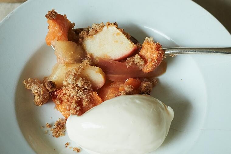 柿とりんごをグラタン皿に入れ、全粒粉のクランブルをのせて焼き上げます。クランブルはカリカリッ、フルー...