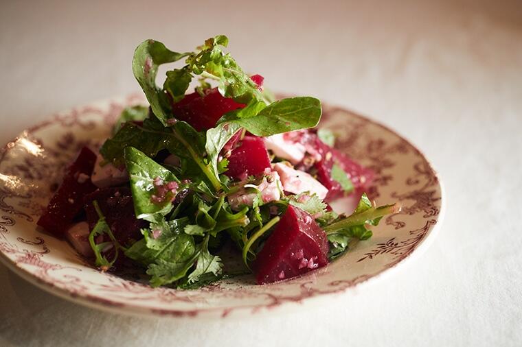 ローストしたビーツは、甘味がギュッと凝縮。塩気が強くてちょっとクセのあるフェタチーズ、香りの強い葉野...