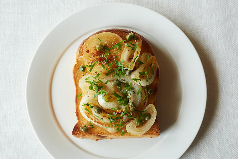 じっくり焼いた玉ねぎはクタクタになって甘くなり、茶色く焦げたところは香ばしい。カリッと焼いたトースト...