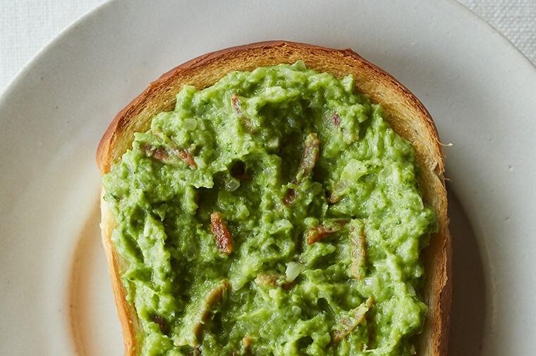 ブロッコリーペーストに生クリームを加えた、優しい味のクリームを、カリッと焼いた食パンにたっぷりのせて...