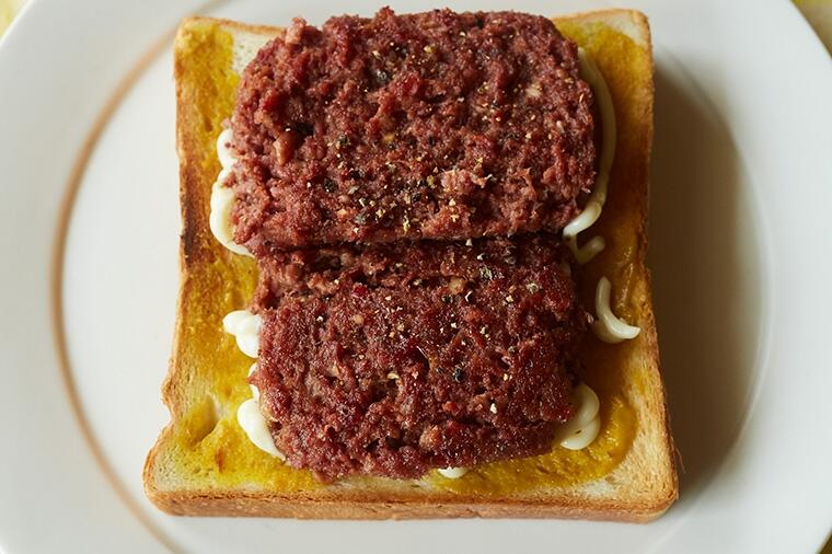 コンビーフの形を崩さないようにして焼いてパンにのせるだけ。粗挽き黒胡椒で香りをプラス。味がしっかりつ...