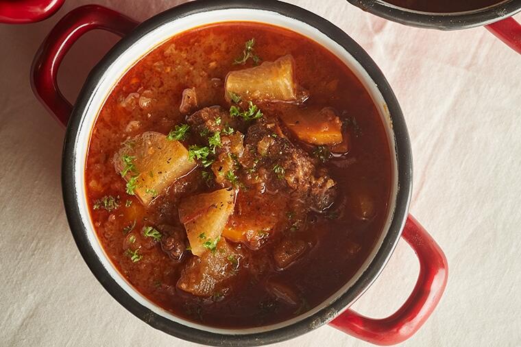 ハンガリーの代表的料理であるグヤーシュスープ。具がごろごろ入っているタイプもあれば小さく切って煮込ん...