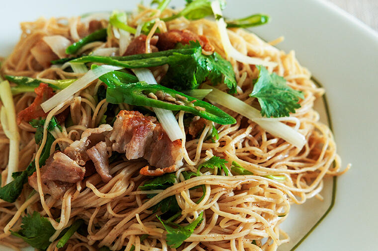 旨味の強い豚バラ薄切り肉と、長ねぎ、青唐辛子、香菜といった香味野菜を取り合わせた、香り高い焼きそば。...