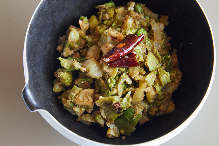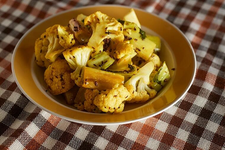 インドのお惣菜の一つ、カリフラワーのサブジに、香ばしく焼いた長ねぎを入れて仕上げた一品。シードスパイ...