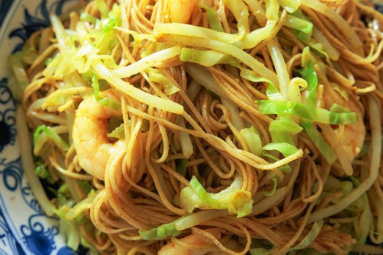 カレーの風味が食欲をそそる、シンガポール風焼きそば。ほんのり海老風味の海老麺とカレーの風味が重なり合...