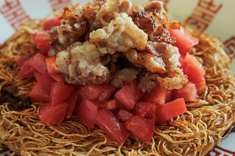醤油味の肉味噌、ザーサイ、薬味をのせた、みんなの好きなカリカリ焼きそば。パンチを出したいときは豆板醤...
