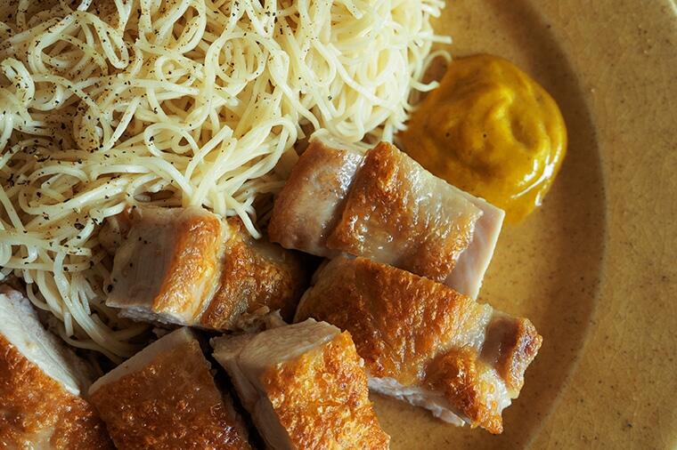パスタのカッペリーニと思いきや、香港卵麺の焼きそば。味つけは塩と胡椒、あとはレモンをたっぷり使って仕...