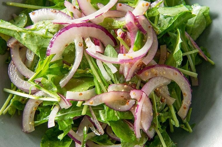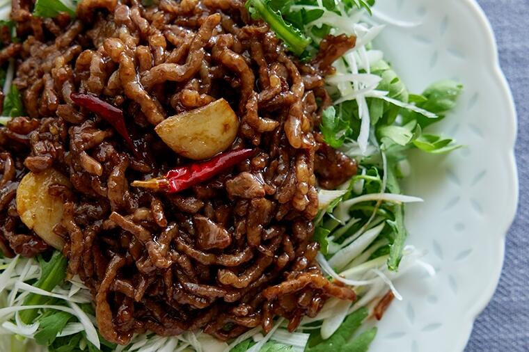 おいしくなった冬の春菊と長ねぎを楽しむためのレシピ。甘辛味で炒めた牛肉と一緒に盛りつけ、ざっくりと混...