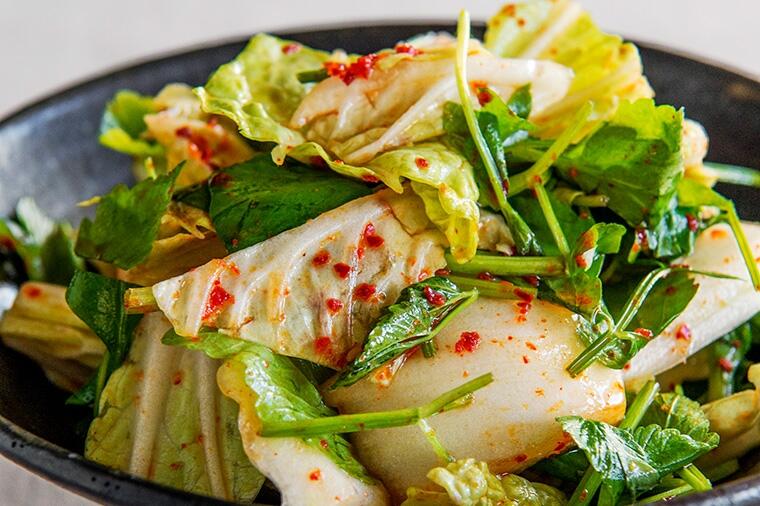 コッチョリは、生の野菜を切って唐辛子だれで和えた、即席キムチ風。山盛り食べても、体がスッキリ!揚げ物...